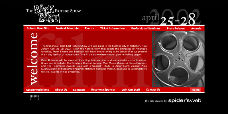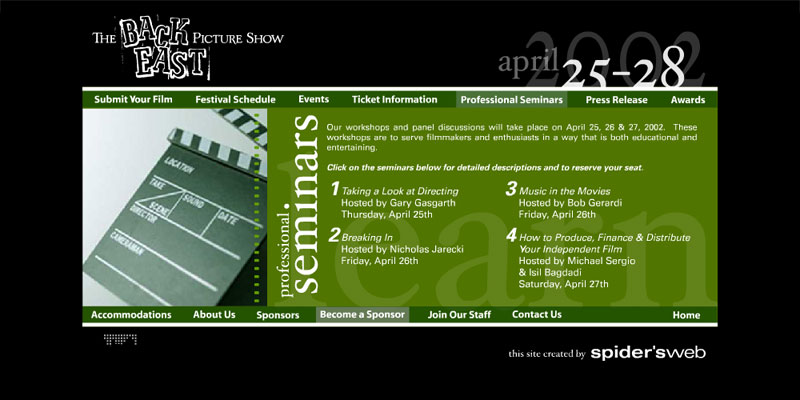 The BEPS approached Spider's Web in their effors to build a event site for the film festival which included general event information, a interactive schedule of films, workshops and award ceremonies. The site required a full content management system to allow staff to keep the site current throughout the film submission and review process as well as the event showings and awards.