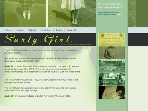Surly Girl is a solo show, with full media accompaniment, that depicts 21 years of family life during and after WW II. This is the era when no one delves into behavioral maladies; no one looks for causes or for solutions. Even if they can afford it.