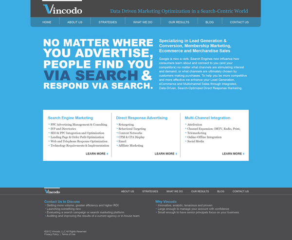 Scope: Vincodo requested that their brand identity along with their web site be given a fresh face. Spider's Web created a clean, focused solution which elevated the firm's virtual face. The secondary focus was to create a design that allowed for the content to be displayed in a format that was visually compelling and offered a user friendly interface.